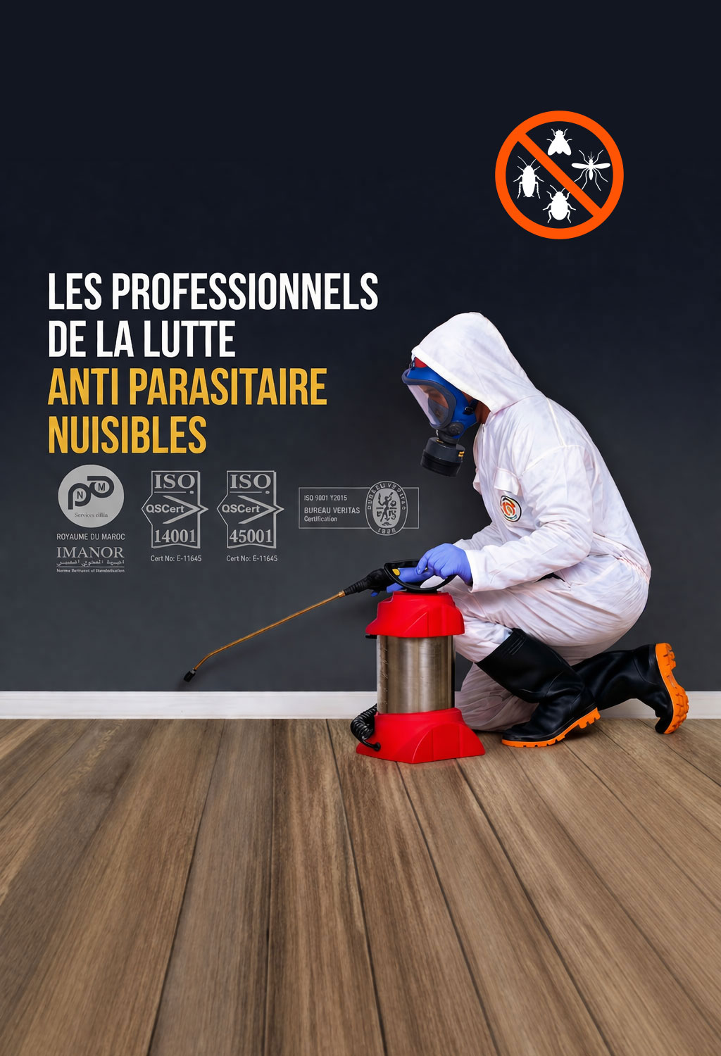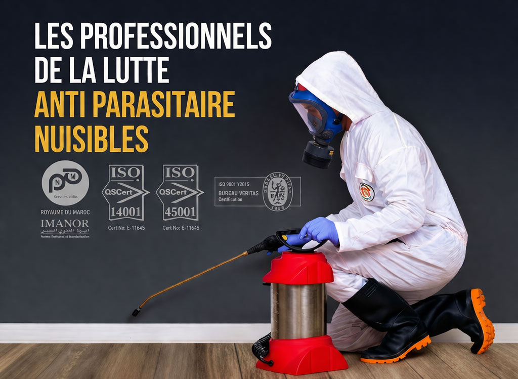 Société de désinsectisation à Casablanca avec 17 ans d’expérience, nous faisons partie des références majeures de notre secteur au Maroc grâce à notre expertise et notre professionnalisme. Certifiée ISO 9001 V 2018, NMEN 16636, ISO 14001 et ISO 45001, nous garantissons des interventions conformes aux plus hauts standards de qualité, de sécurité et d’environnement.